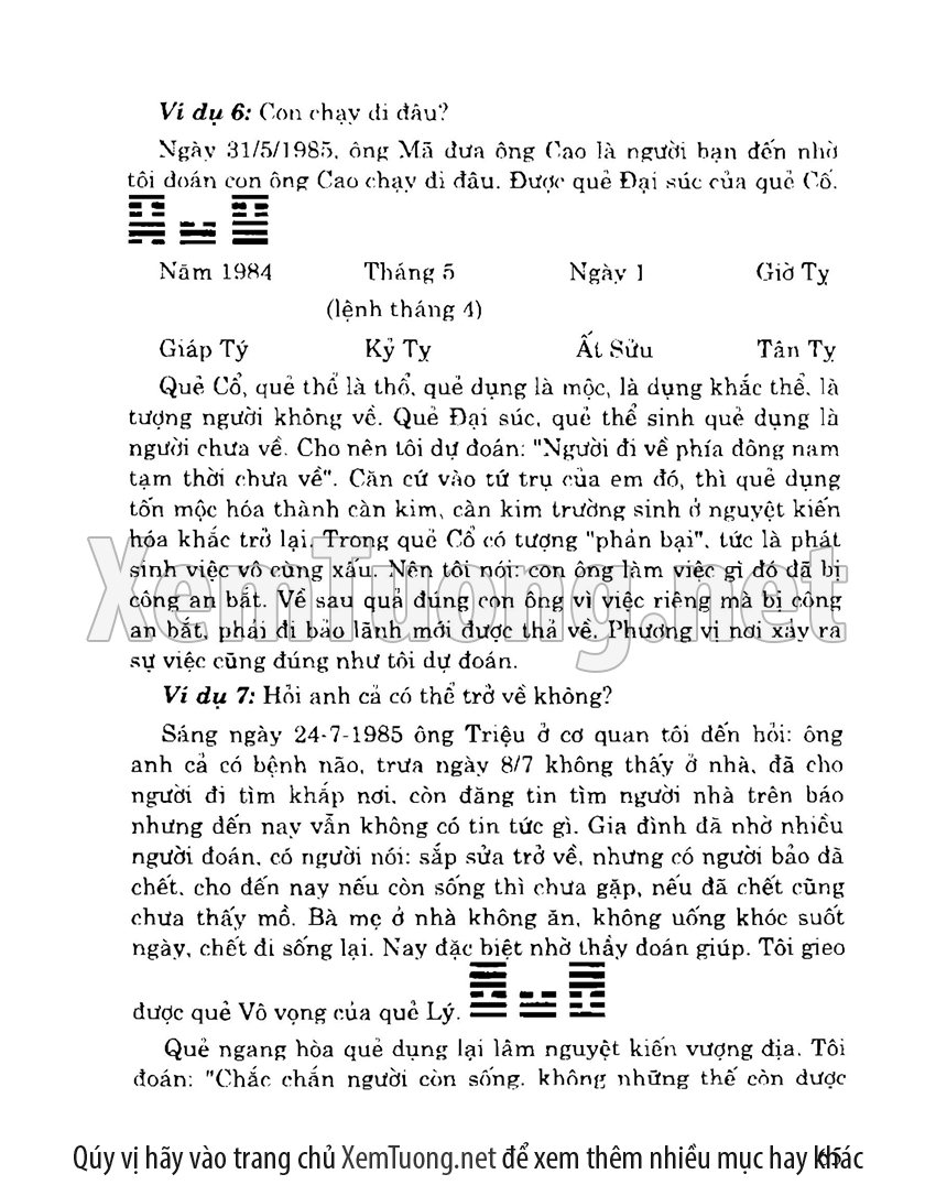 + Sách chủ yếu giới thiệu các ví dụ đoán quẻ tích lũy được trong thực tiễn của tác giả. Trong sách có phương pháp đoán theo tượng quẻ, đoán theo tượng hào và phương pháp đoán kết hợp. Ngoài ra có một số quẻ được chọn lựa từ tinh hoa của các học viên, một số nữa là chọn những quẻ hay, điển hình trong sách cổ. Trong lời giải quẻ luôn thể hiện nhất quán các phương pháp đoán quẻ cơ bản là: “một hào động”, “tượng quẻ”, “dịch lí”, “số lí”, “ngũ hành sinh khắc” và “ngoại ứng”.