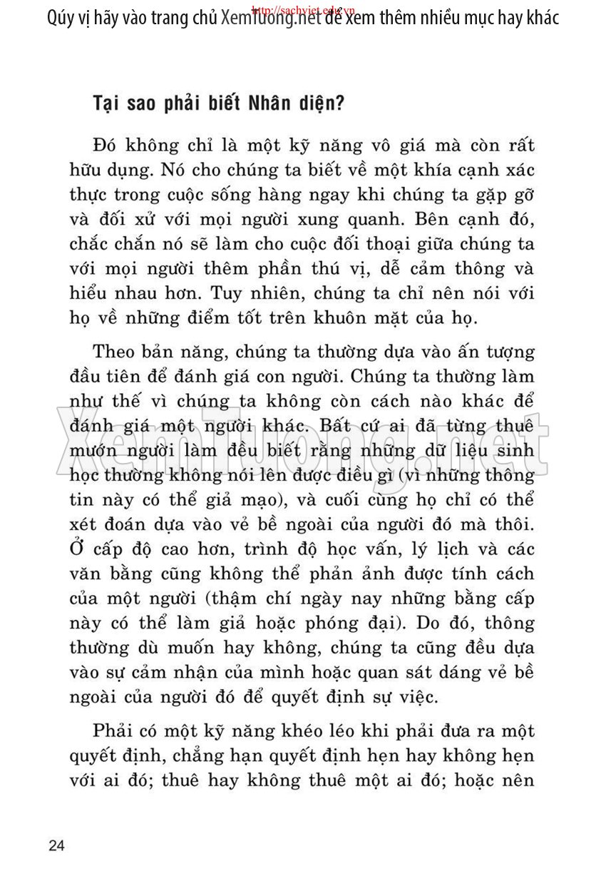 Ngạn ngữ Anh có câu: “Đừng bao giờ đánh giá gỗ qua nước sơn”. Ngược lại, không ai phủ nhận cái nhìn đầu tiên qua tướng mạo và khuôn mặt là rất ấn tượng. Điều này theo ngành khoa học cổ xưa của Á Đông là thuật Nhân diện học. Mỗi người có một nét riêng, vì vậy, dù ý thức hay không ý thức, chúng ta cũng bị cuốn hút vào sự phán đoán của nhân diện. Thế nhưng, nhân diện không phải được dùng để đánh giá hay phê phán, mà là một khoa học giúp bạn đón biết được tính cách, tâm tư, cũng như vận số của mỗi người.