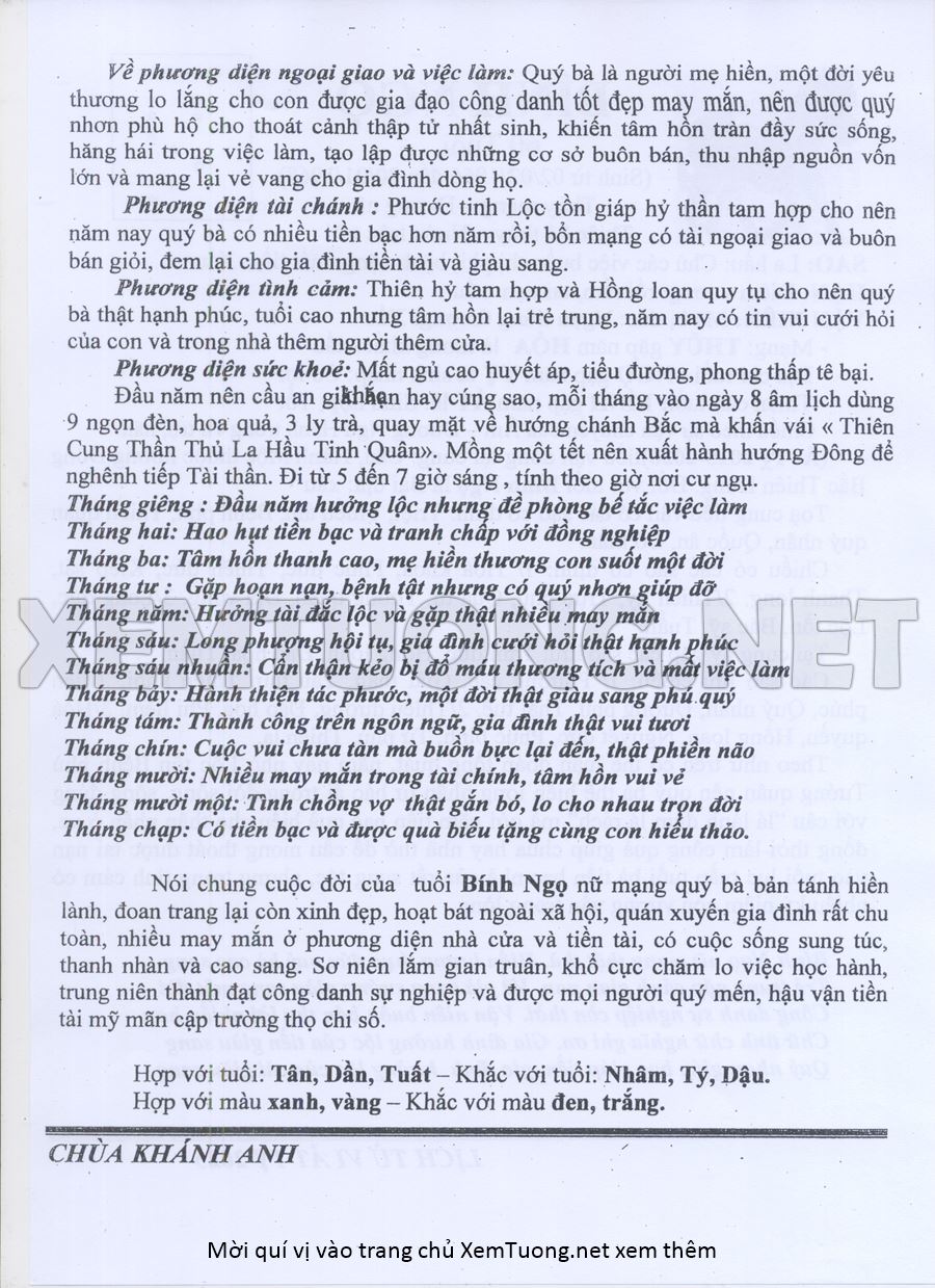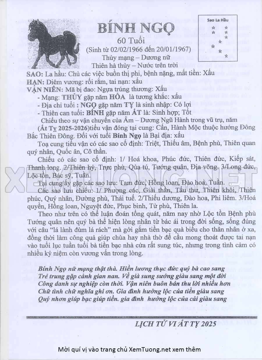 Tử Vi Năm Ất Tỵ 2025 mạng nữ BÍNH NGỌ