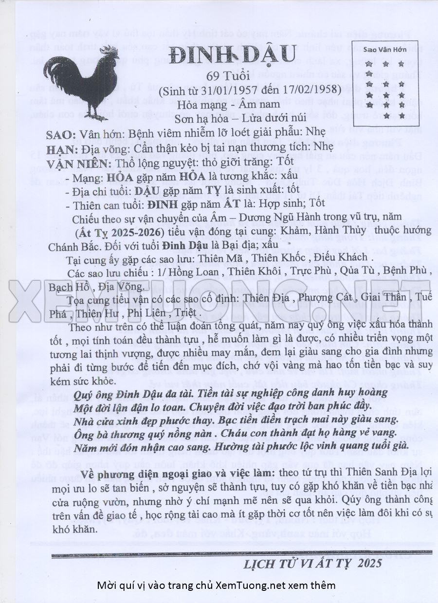 Tử Vi Năm Ất Tỵ 2025 mạng nam ĐINH DẬU
