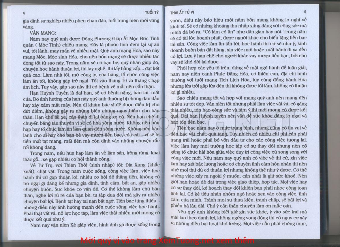 (Lưu ý: Thái Ất Tử Vi được chúng tôi scan từ sách, do đó mỗi tuổi sẽ có nhiều trang, quý vị xem xong hãy nhấn vào trang tiếp theo để xem hết phần tuổi muốn xem. Nếu quý vị xem bằng điện thoại thì hãy kéo qua lại để xem phần bị khuất.)
