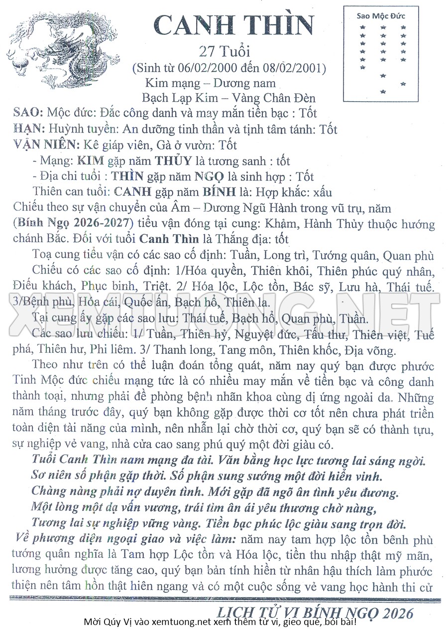 Tử Vi Năm Bính Ngọ 2026 mạng nam CANH THÌN