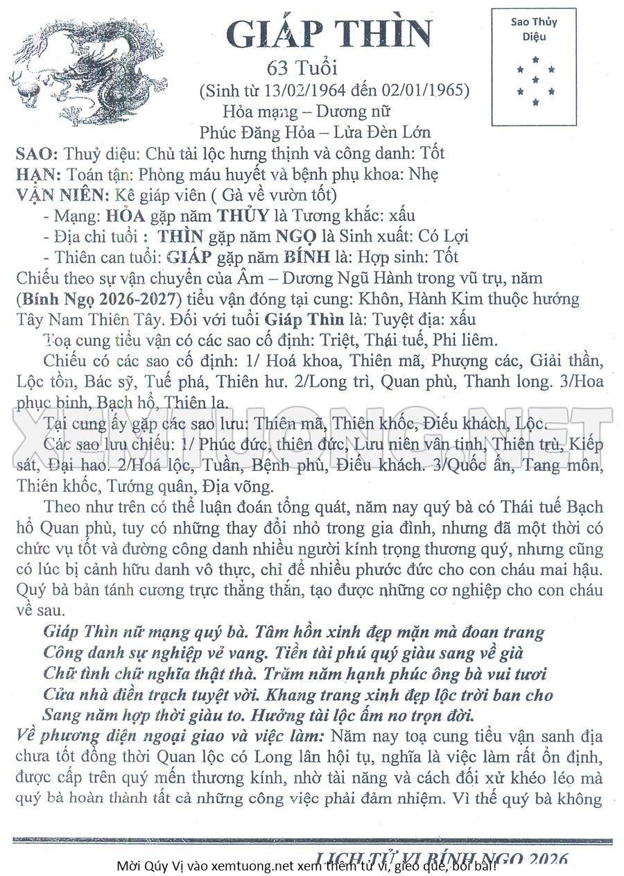 Tử Vi Năm Bính Ngọ 2026 mạng nữ GIÁP THÌN