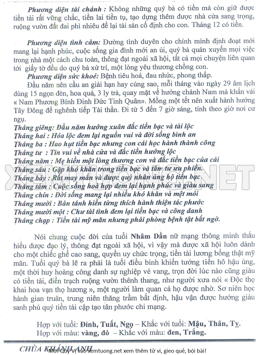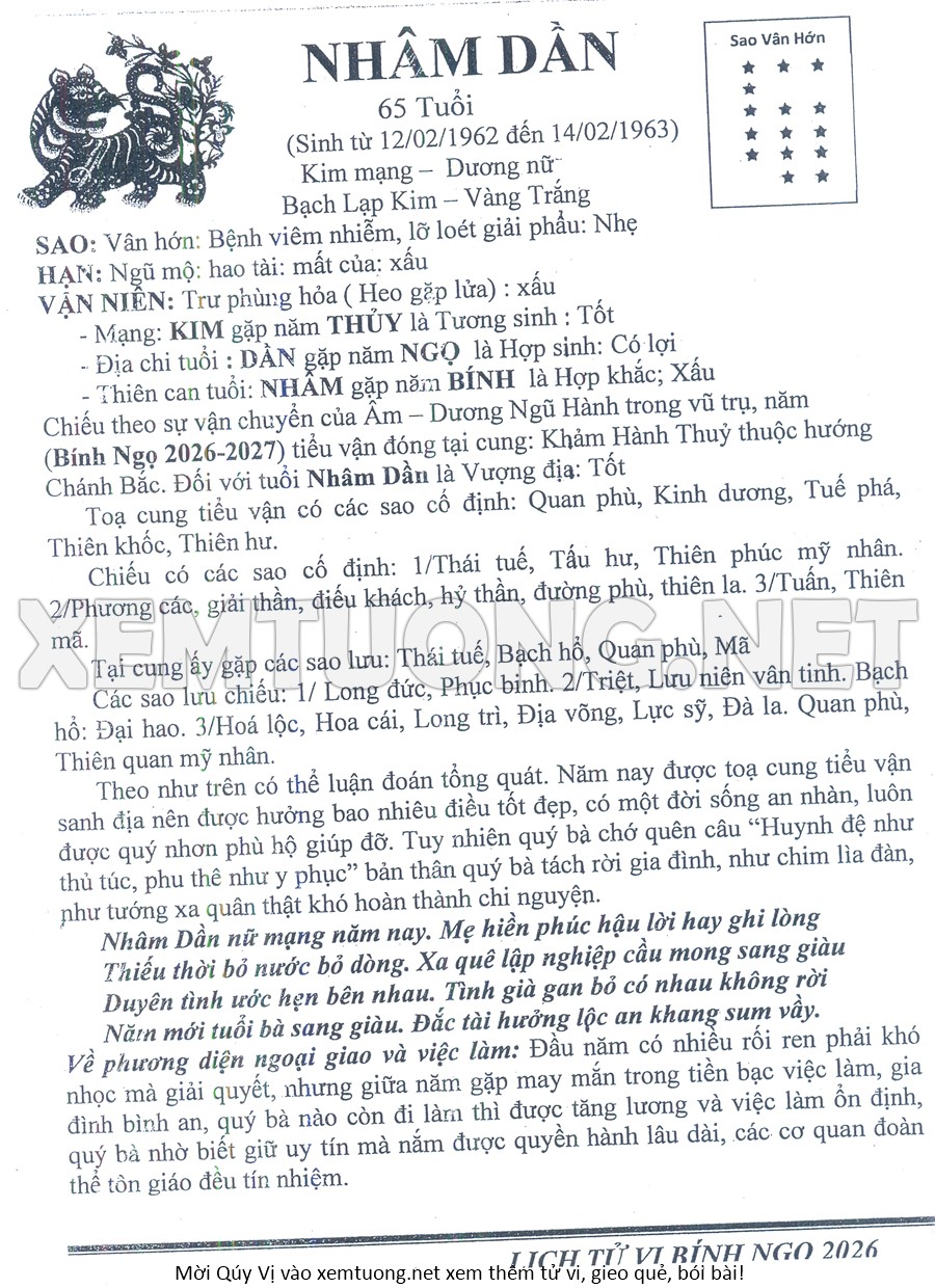 Tử Vi Năm Bính Ngọ 2026 mạng nữ NHÂM DẦN
