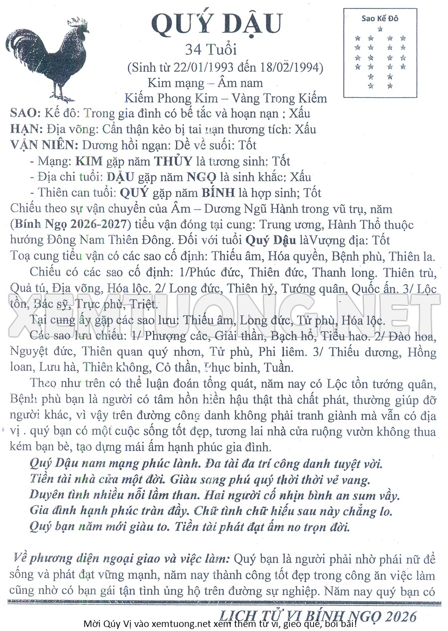 Tử Vi Năm Bính Ngọ 2026 mạng nam QUÝ DẬU