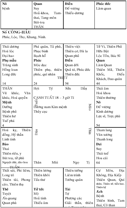 Phúc, Mệnh, Thân, Quan, Di, Taì: