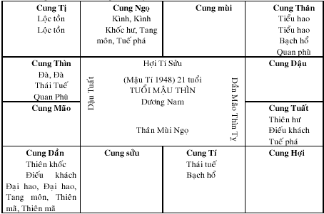Thí du ï: Mệnh ở Ngọ, xem cung Ngọ, Dần, Tuất, Tí và lục hợp là cung Mùi.