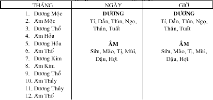 Bản đồ phân âm Dương, Ngũ Hành của Tháng, Ngày, Giờ.